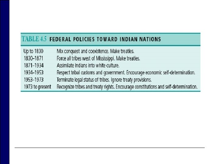 Relations with Indian Tribes o Treaties between American Indian Nations and federal government n n n Affect 34 states Legal status of various tribes: domestic dependent nation o Sovereignty that makes an Indian tribe in the U. S. outside the authority of state government but reliant on the federal government for the definition of tribal authority o Trust relationship: federal government obligated to protect Indian interests Policy approach of federal government toward Native Americans has varied widely over time o From relocation, assimilation, to abandonment (which led to protests) and the return to the model of respect of tribal customs and promotion of economic self-determination n n States are not parties to these treaties and have no direct legal authority over tribes. o Compacts Reservation land Trust land Move to incorporate written constitutions into tribal governance