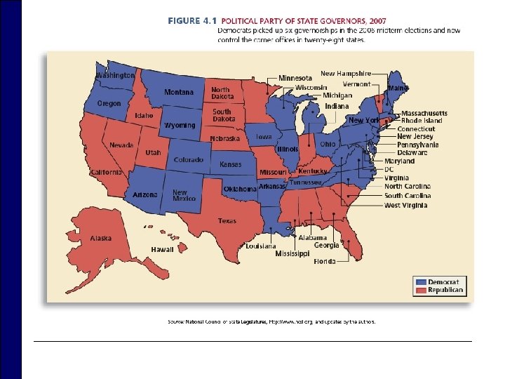 Elections and Political Parties o Determine who will fill offices and direct the state government o Almost all elections are partisan. n Exceptions are judicial elections (and the senate in Nebraska’s unicameral legislature). o Party histories vary among states. n n Competition between Republican and Democratic Party since the Civil War From 1994 to 2002, Republicans have made gains in state elections, particularly in South. o Today, Southerners are significant members within the Republican Party – nationally and regionally.