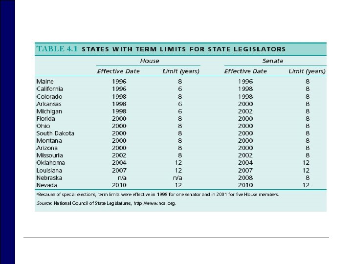 State Legislatures o Originally strong yet non-professional in nature n Half original state legislatures began without a n o o gubernatorial veto check Many formulated budgets and made administrative appointments. Citizen legislators Baker v. Carr (1962): turning point n n Today: 43 state legislatures meet every year; only seven every other year n Floor sessions longer n More committee work n All but Nebraska have two chambers. Term limits n Restrictions that exist in some states about how long an individual may serve in state or local elected offices
