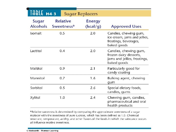 Alternative Sweeteners Sugar Alcohols 1. CHOs that provide less energy than sucrose (2 -3 kcals/gm) because not completely absorbed 2. May cause gas, abdominal discomfort, diarrhea 3. Less cariogenic than sugar