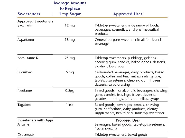 Alternative Sweeteners Artificial Sweeteners 1. Saccharin = “Sweet ‘N Low” or “Sugar Twin” 2. Aspartame = “Equal” or “Nutrasweet” must avoid if have phenylketonuria 3. Acesulfame-K = “Sunette” or “Sweet One” 4. Sucralose = “Splenda”