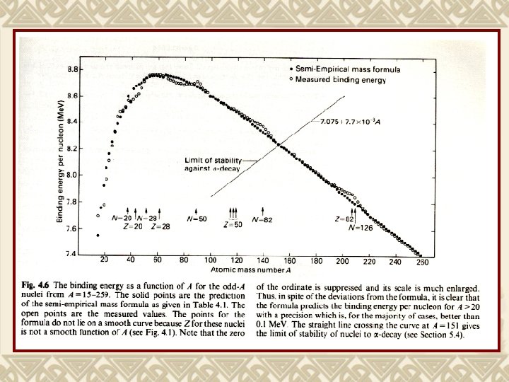 4 -5 The implications of the semi-empirical mass formula 1. The volume binding term a. VA in the mass formula means that each nucleon interacts only its nearest neighbors and that the constant density is equivalent to a separation from nearest neighbors does not change with A. All this means that nuclear force saturates and is short range. 2. The nuclear density of nucleons is approximately 1 in every 7 cubic fermis so that the average separation is about 1. 9 fm. Thus the range must be 1 -2 fm.