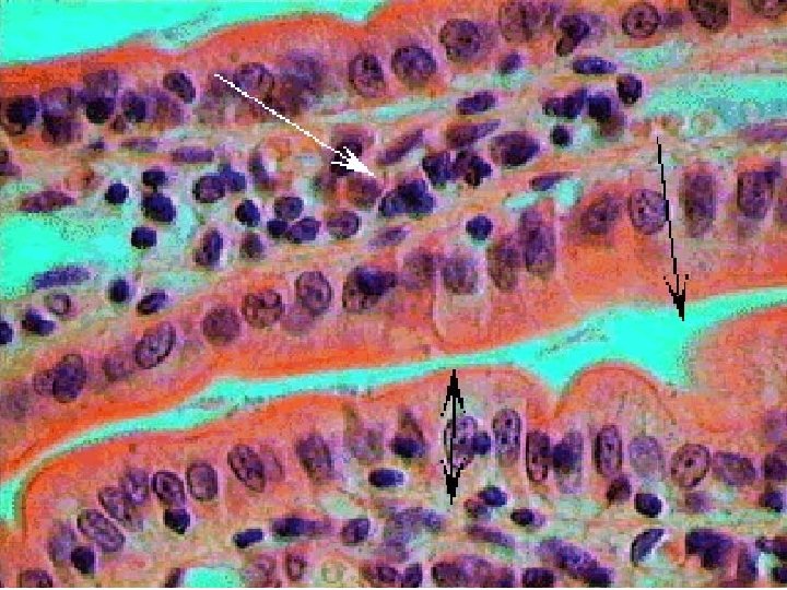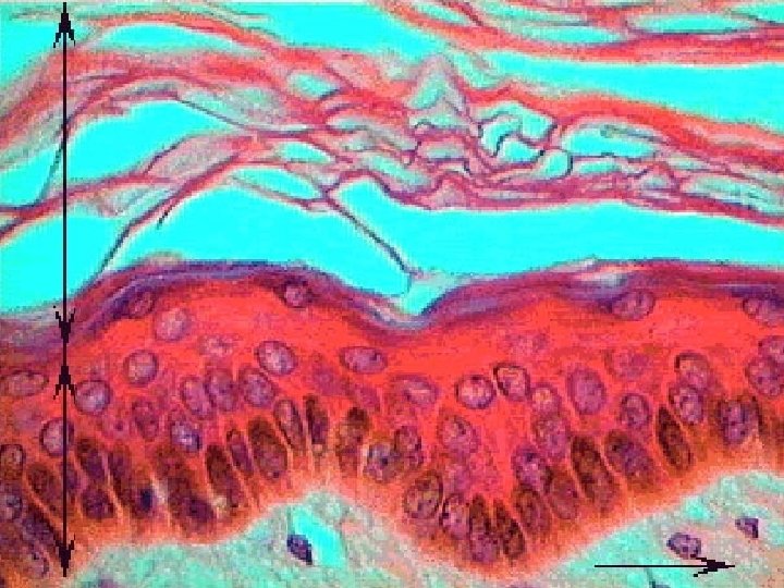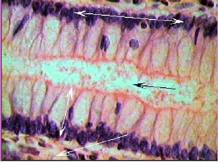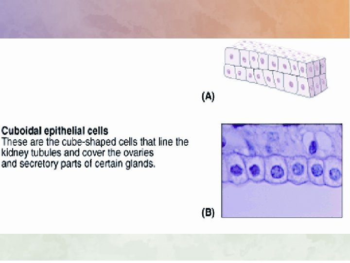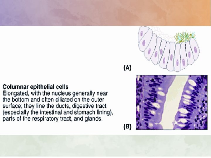 Epithelial tissue – char. and location – 2. Cuboidal epithelial cells • Cube-shaped cells line the kidney tubules and cover ovaries and secretory parts of certain glands. – 3. Columnar epithelial cells • Are elongated, w/the nucleus generally near the bottom and often ciliated on the outer surface. • Line ducts, digestive tract, parts of the respiratory tract, and glands.