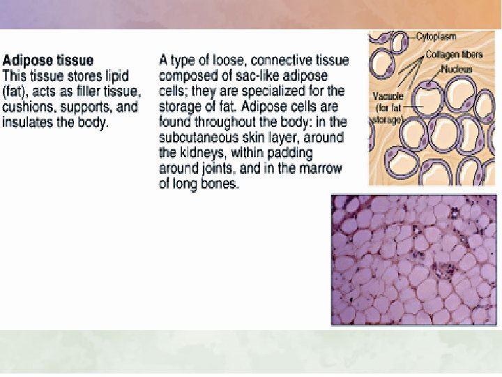 Connective tissue – function • A. Adipose tissue – Stores lipid, acts as filler tissue, cushions, and insulates the body. - Type of loose connective tissue composed of saclike adipose cells; specialized for storage of fat. - Found t/o the body; skin, around the kidneys, w/i padding of joints, and marrow of long bones.