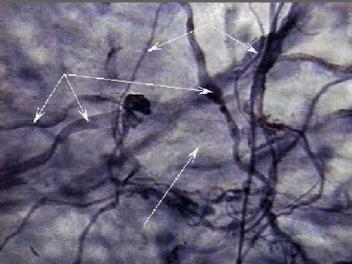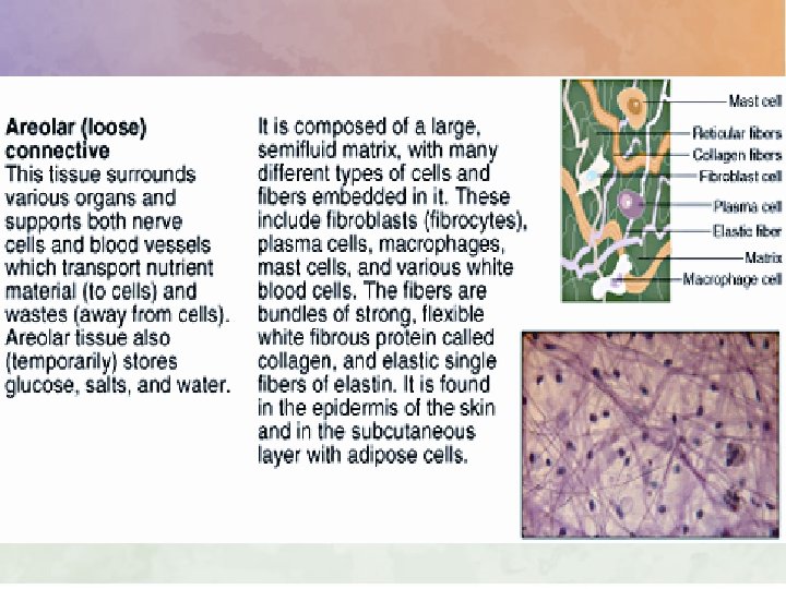 Connective tissue – char and location • B. Areolar (loose) tissue – Tissue surrounds various organs and supports both nerve cells and blood vessels which transport nutrient matl’s to cells and wastes from cells. – Also temporarily stores glucose, salts, and water. – Composed of large, semifluid matrix, w/many different types of cells and fibers.