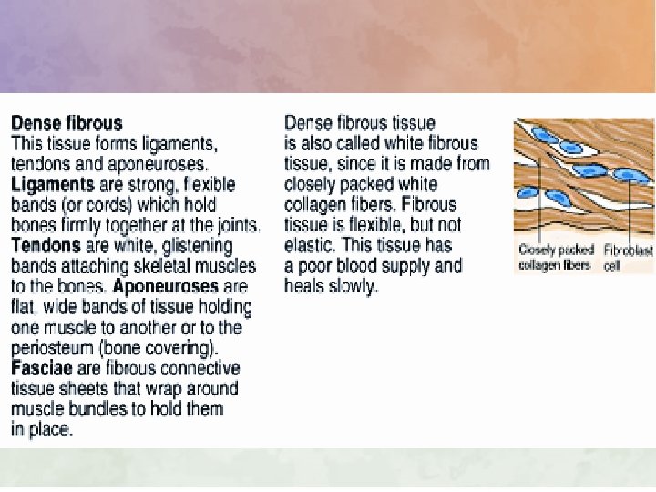 Connective tissue – char and location • Dense fibrous tissue is also called white fibrous tissue b/c it is made from closely packed white collagen fibers. Fibrous tissue is flexible, but not elastic. • Has poor blood supply and heals slowly.