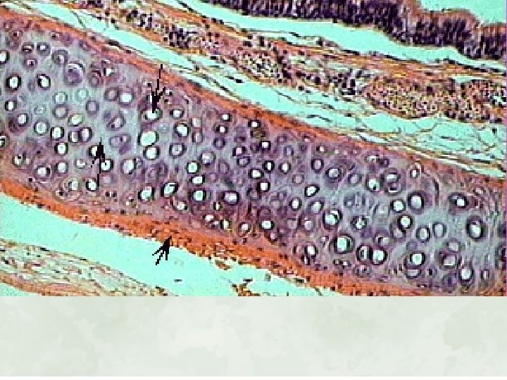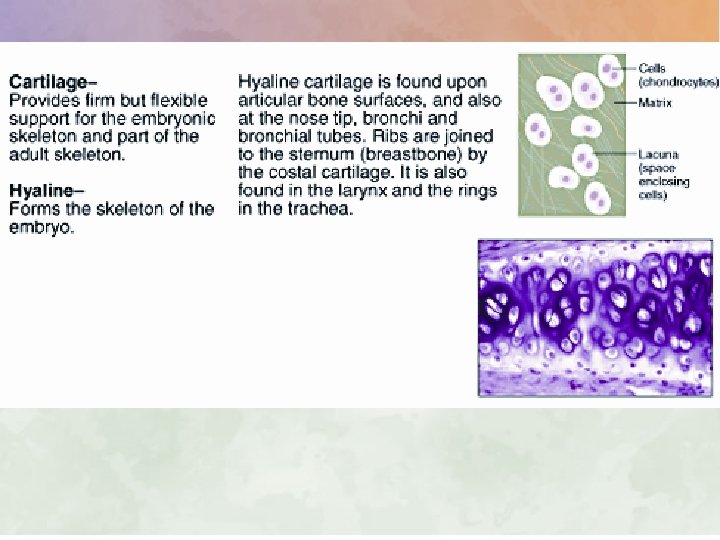 Connective tissue – function – 2. Cartilage • Provides firm but flexible support for the embryonic skeleton and part of the adult skeleton. • A. Hyaline – forms the skeleton of the embryo. – Char. and location – found on articular bone surfaces and nose tip, bronchi, and bronchial tubes. Ribs are joined to the sternum by the costal cartilage. Also found in the larynx and rings of the trachea.