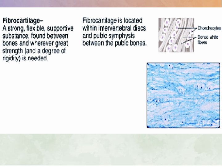 Connective tissue – function • B. Fibrocartilage – strong, flexible, supportive substance, found b/w bones and wherever great strength is needed. • Char and location – located w/i the intervertebral discs and pubic symphysis b/w the pubic bones. • C. Elastic cartilage – intercellular matrix is embedded w/a network of elastic fibers and is firm but not flexible. • Char and location – inside the auditory ear tube, external ear, and larynx.
