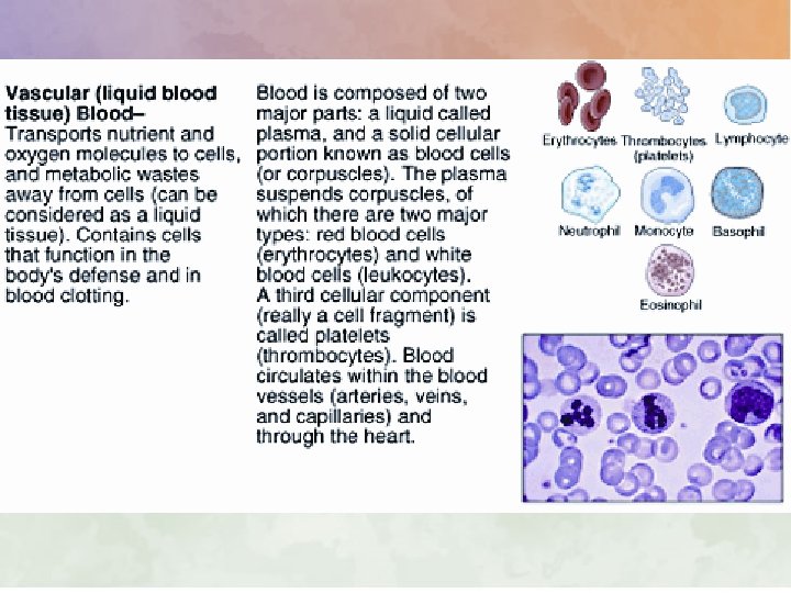 Connective tissue – function – E. Vascular (liquid blood tissue) • 1. Blood – transports nutrient and oxygen molecules to cells and metabolic wastes from cells. Contains cells that function in the body’s defense and in blood clotting. – Char and location – 2 parts: liquid called plasma and solid called blood cells. – Plasma suspends the cells. RBC’s , WBC’s, and platelets (blood clotting, thrombocytes). – Blood circulates w/I the blood vessels (arteries, veins, and capillaries) and t/the heart.