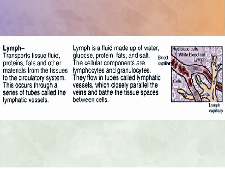 Connective tissue – function – 2. Lymph – transports tissue fluid, proteins, fats, and other matl’s from the tissues to the circulatory system. • Char and location – consists of water, glucose, protein, fats, and salts. • Cellular components are lymphocytes and granulocytes. • Flow in tubes called lymphatic vessels which closely parallel the veins and bathe tissue spaces b/w cells.