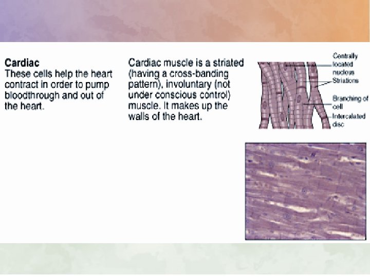 Muscle tissue • A. Cardiac muscle – Function – cells help the heart contract in order to pump blood t/ and out of the heart. – Char and location – a striated (having cross-banding pattern), involuntary (not under conscious control) muscle. Makes up the walls of the heart
