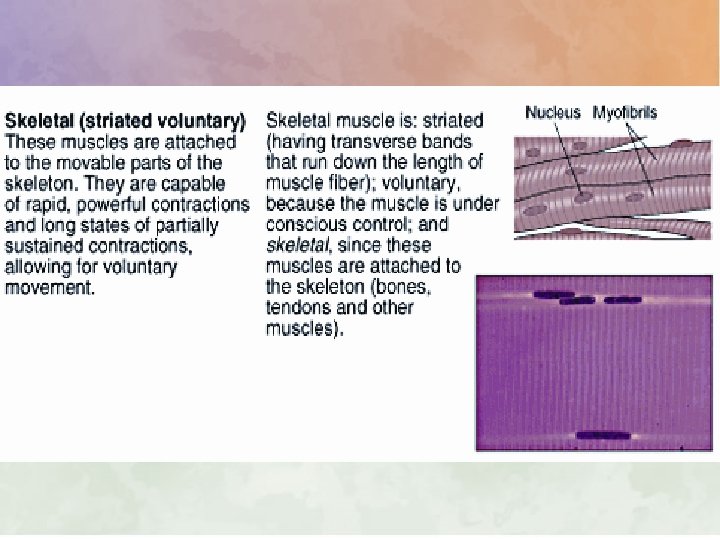 Muscle tissue – B. Skeletal muscle • Function - are attached to the movable parts of the skeleton. Are capable of rapid, powerful contractions and long states of partially sustained contractions, allowing for voluntary movement. • Char and location – striated, voluntary and skeletal.