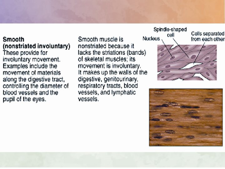 Muscle tissue – C. Smooth muscle • Function – provide involuntary movement. • Char and location – nonstriated, involuntary. Makes up walls of digestive tract, genitourinary tract, blood vessels, and lymphatic vessels.