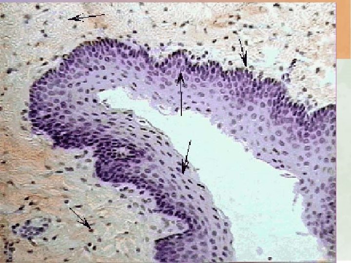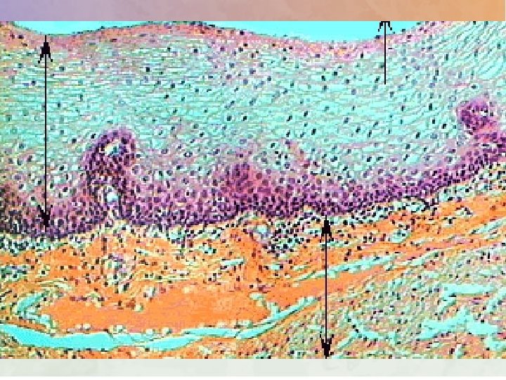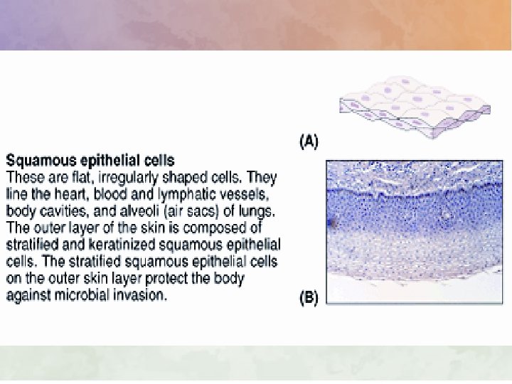 Epithelial tissue – char. and location • A – Covering and lining tissue – cells can be stratified (layered), ciliated or keratinized (hard, nonliving substance. ) – 1. Squamous epithelial cells • Are flat, irregularly shaped cells. • Line the heart, blood and lymphatic vessels, body cavities, and alveoli of the lungs. • Outer layer of skin consists of stratified squamous epithelia cells. These protect the body against microbial invasion.