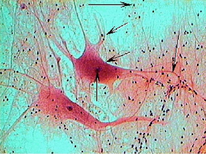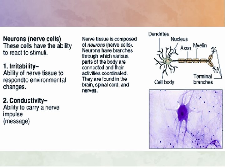Nervous tissue • Neurons – Function – react to stimuli • 1. Irritability – ability of nerve tissue to respond to environmental changes. • 2. Conductivity – ability to carry a nerve impulse (message). – Char and location – have branches t/which various parts of the body are connected and their activities coordinated. They are found in the brain, spinal cord, and nerves.