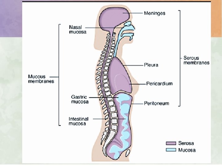 Serous membrane • The serosa is given to the specific serous membranes. – Pleural memb – lines the thoracic or chest cavity and protects the lungs. The fluid is called pleural fluid. – Pericardial memb – lines the heart cavity and protects the heart. The fluid is called pericardial fluid. – Peritoneal memb – lines the abdominal cavity and protects the abdominal organs. The fluid is called peritoneal fluid.