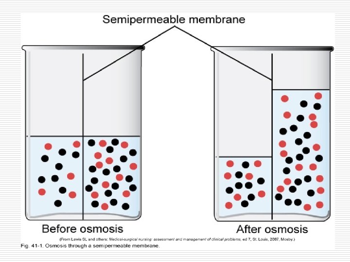 Movement of Body Fluids Osmosis = movement across a semi-permeable membrane from area of lesser concentration to are of higher concentration; high solute concentration has a high osmotic pressure and draws water toward itself Osmotic pressure = drawing power of water (Osmolality) Osmolarity = concentration of solution