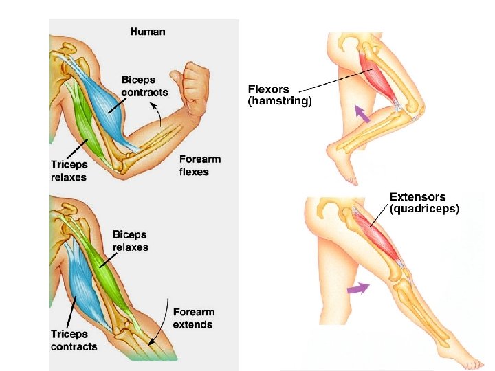 Muscles movement • Muscles do work by contracting – skeletal muscles come in antagonistic pairs • flexor vs. extensor – contracting = shortening • move skeletal parts – tendons • connect bone to muscle – ligaments • connect bone to bone