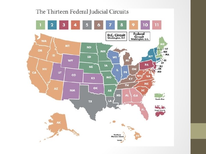A Dual Court System • District Courts - have original jurisdiction - (the authority to try a case the first time it is heard) over most federal court cases • Courts of Appeals (Appellate Courts)- are intermediate courts between the lower courts and the highest court • They have the authority to hear appeals and review cases from lower courts • Appellate jurisdiction - any party to a suit decided in a federal district court may appeal the decision to the federal court of appeals in the circuit where the case was tried