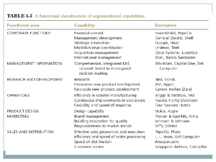 Approaches to Classifying capabilities �Functional Analysis: identifies capabilities in relation to each of the principal functional areas of the firm �Value-chain Analysis: separates the activities of the firm into sequential chain.