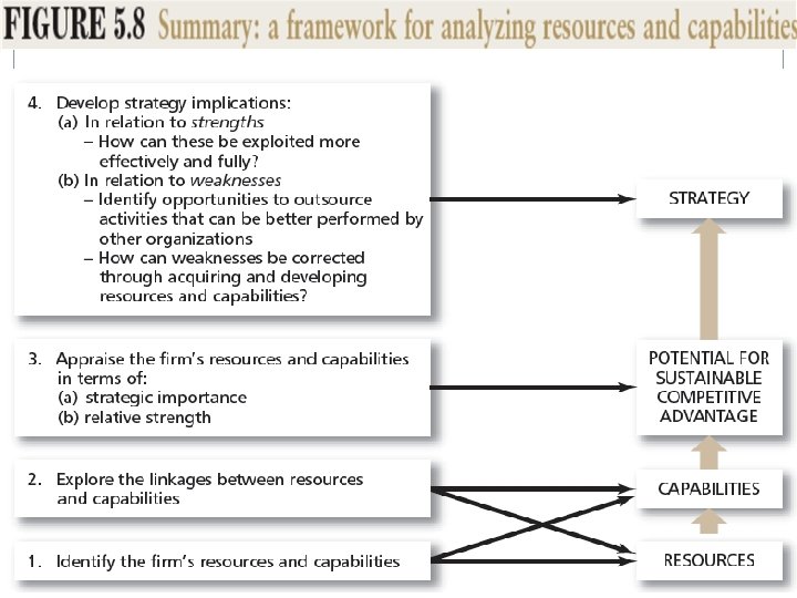 Chapter objectives �Appreciate the role of a firm’s resources and capabilities as a basis formulating strategy �Identifying and appraise the resources and capabilities of a firm �Evaluate the potential for a firm’s resources and capabilities to confer sustainable competitive advantage �Use results of resources and capability analysis to formulate strategies that exploit internal strength while defending against internal weaknesses
