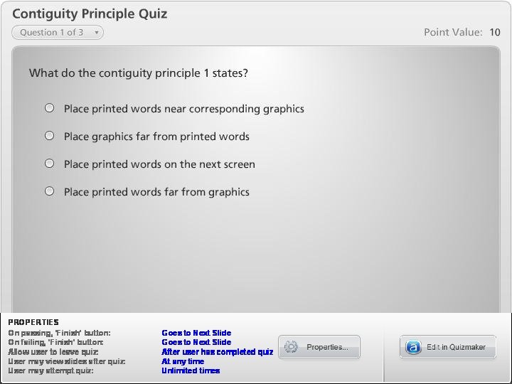 Contiguity Principle 2: Synchronize Spoken Words with Corresponding Graphics � This principle deals with coordinating spoken words and graphics at the same time. � When designing your e-learning course consider how spoken words are integrated with on-screen graphics.