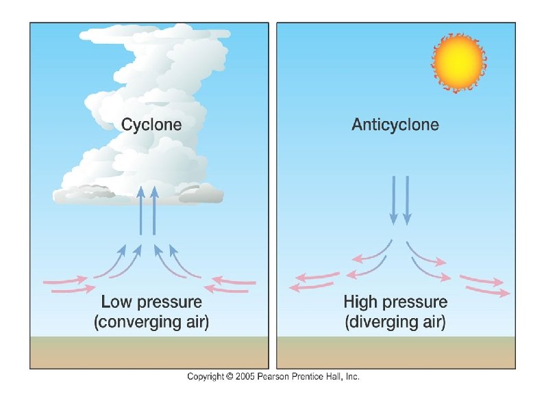 High Pressure Systems Anti-cyclones (high pressure center) Air descends Moves divergently near the surface (outward from center) Flows clockwise in the Northern Hemisphere Usually associated with clear skies and calm weather