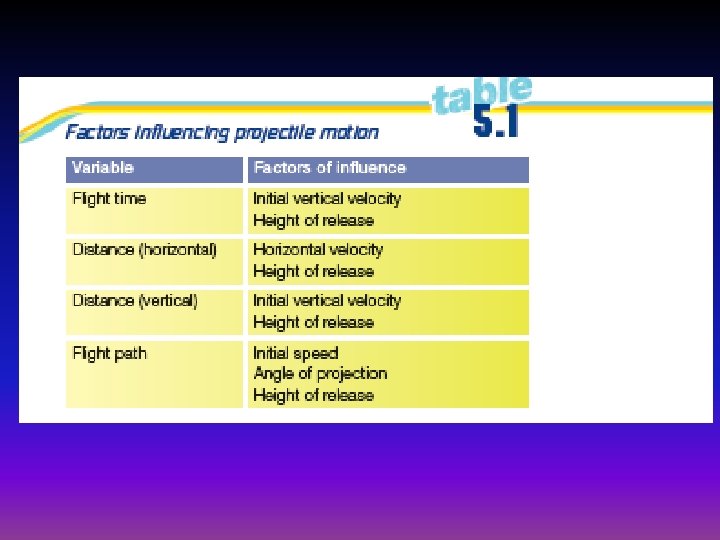 Factors affecting the path of a projectile The path of a projectile depends on three factors: • angle of projection (or release) • speed of release (or projection) • height of release (or projection). Table on next slide