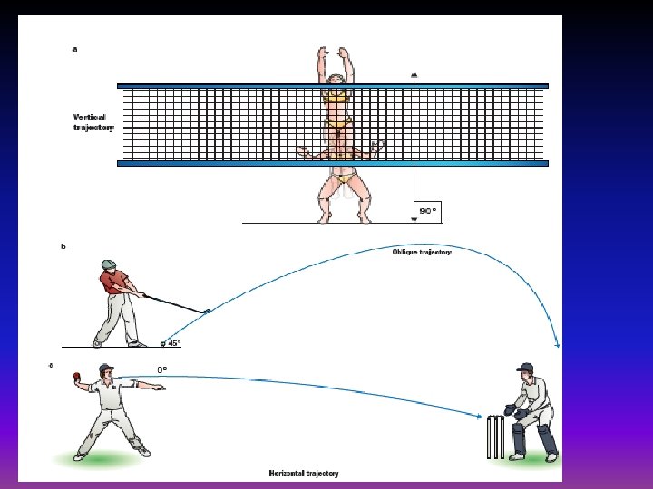 Angle of projection • The angle of projection is the angle at which an object is released into the air. • This angle will determine the flight path of the projectile. • There are three shapes that a flight path can form, depending on the angle of release. • A is the first is a purely vertical shape where the body or object goes straight up and comes straight back down again. • b is the second flight path is parabolic and occurs when the angle of projection is between 0° and 90°. • c is the final shape determined by the angle of release is half a parabola. An object projected at 0° (perfectly horizontal) will follow this path.