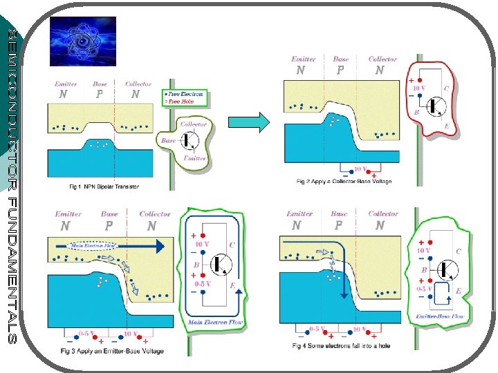 I-V of Common-Base • Ic is equal to IE (i. e 0 1) & independent of of VBC • Ic remains constant even down to 0 V for VBC (holes are still extracted by C) • Hole distributions (See fig. 5 -9) Figure 5 -8. (a) Commonbase configuration of a p-n-p transistor. (b) Its output current-voltage characteristics.