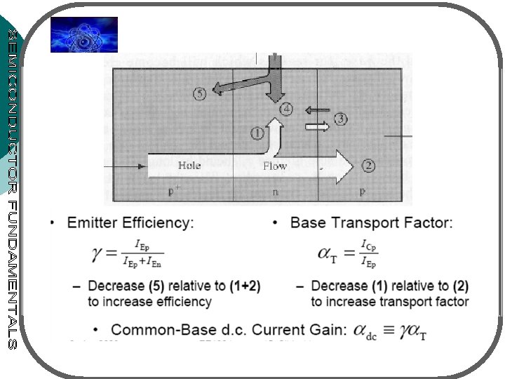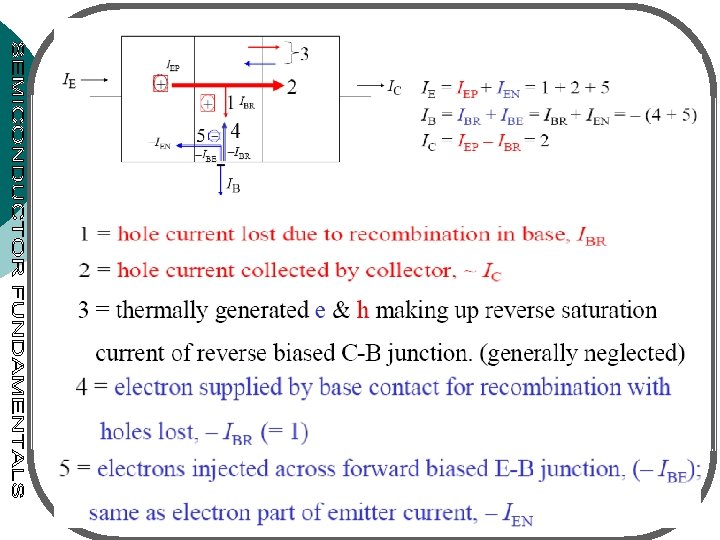 Current gain • Assume no generationrecombination Is in the depletion regions • Holes injected from E: IEp (largest I component) • Most of injected holes will reach C junction - give rise ICp • IBB : electrons that must be supplied by the B to replace electrons recombined with the injected holes (IBB=IEp-ICp) • IEn: I arising from electrons injected from B to E – however not desirable • ICn: thermally generated electrons that are near the B-C junction edge and drift from C to B – direction of Figure 5. 5. Various current components in a electron I is opposite the electron p-n-p transistor under active mode of flow operation. The electron flow is in the opposite direction to the electron current.