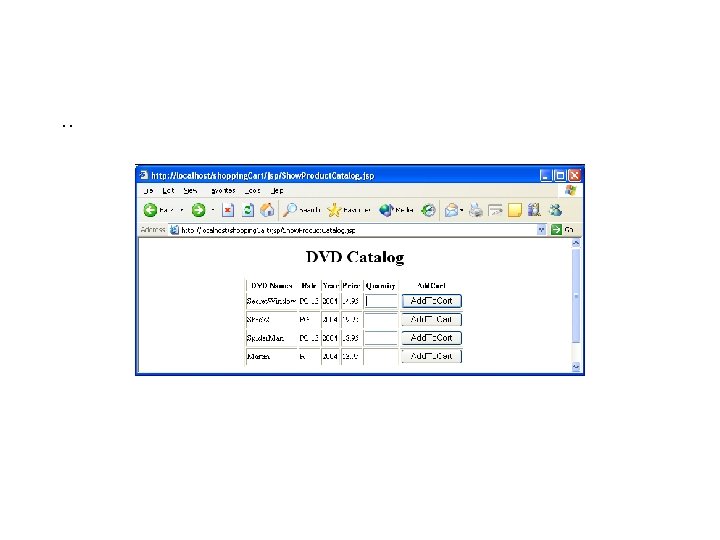 <th>Rate</th> <th>Year</th> <th>Price</th> <th>Quantity</th> <th>Add. Cart</th> </tr></thread> <%-- Display all DVD products row by row on the table, add an “add. Cart” button at the end of each row to allow clients to select --%> <% while (prod. List. Iterator. has. Next()){ DVD movie = (DVD)prod. List. Iterator. next(); String movie. Quantity = "movie. Quantity"; %> <tr> <form name="addto. Shopping. Cart" action="/shopping. Cart/servlet/add. To. Shopping. Cart" method="POST"> <td><%= movie. get. Movie() %></td> <td><%= movie. get. Rating() %></td> <td><%= movie. get. Year() %></td>