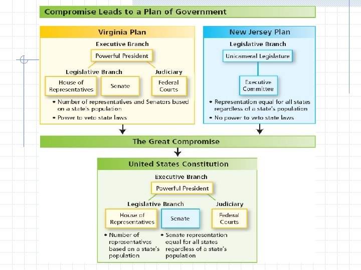 Sect. #2 Cont. Virginia Plan n n n Edmund Randolph Bicameral Legislature. State representation was based upon population. Power to tax Power to regulate trade. Define: VETO Proposed executive and judicial branches New Jersey Plan n n n William Paterson Unicameral Legislature. One state – one vote concept. (Like Articles) Power to tax Power to regulate trade. National executive & judicial branches
