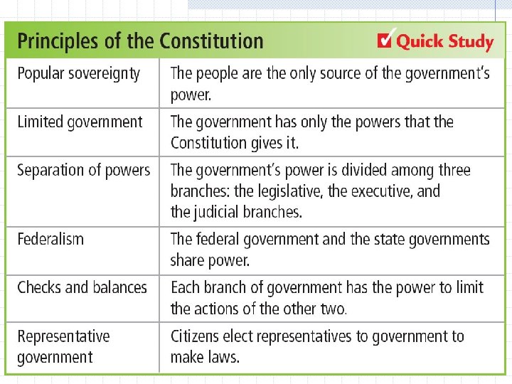 Ratifying the Constitution The Struggle Over Ratification Main Idea: Two groups quickly emerged in the debate over the Constitution: the Federalists who favored ratification of the Constitution and the Antifederalists who opposed it. Initially, the Federalists gained more support than the Antifederalists. Ratifying Conventions Main Idea: By mid-January of 1788, the Federalists had won ratification in five states. However, the Antifederalists mounted a strong fight in the remaining states whose support the Federalists sought. Principles of the New Constitution Main Idea: The Republic established by the Constitution of the United States became a symbol of freedom to countries around the world. Key principles of the Constitution included: popular sovereignty, limited government, separation of powers, federalism, checks and balances, and representative government. The Constitution Endures Main Idea: The Constitution is a relatively brief document, consisting of only 7, 000 words. Some politicians, like Thomas Jefferson, argued that it should be interpreted literally to restrict federal power. Most Federalists, including George Washington, insisted that the Constitution be read broadly to allow for the expansion of federal power when necessary. Continued…