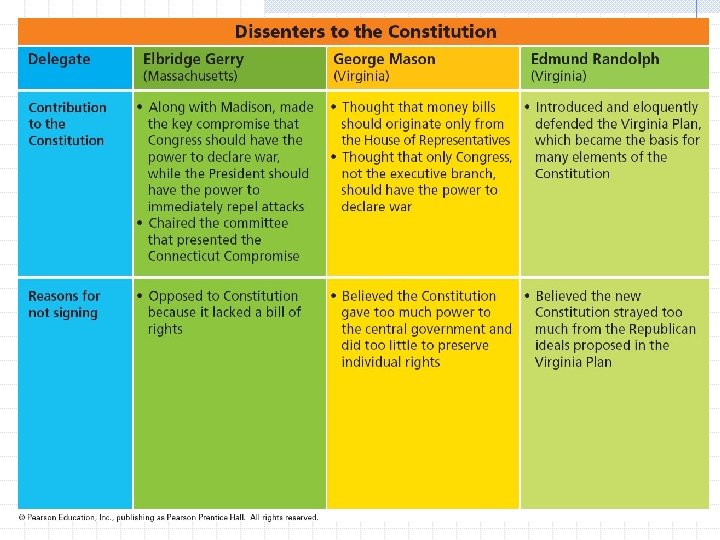Quote from Elbridge Gerry: (one of the conventionists who didn’t sign!) “My principal objections to the plan are…that some of the powers of the legislature ambiguous, and others…dangerous; that the Executive…will have undue influence over the legislature; that the judicial department will be oppressive…and that the system is without the security of a bill of rights. ”