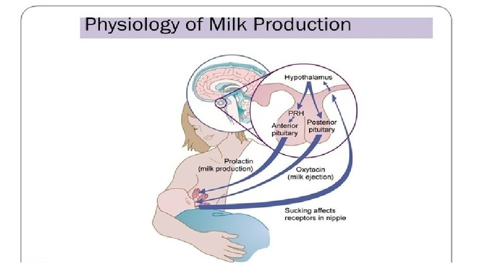 Role of oxytocin in lactation § Suckling of baby stimulate hypothalamus to release of oxytocin from posterior pituitary and prolactin from anterior pituitary. § Prolactin acts on milk-making tissue to produce milk for baby. § Oxytocin contracts myoepithelial cells in the mammary gland, which causes ‘milk let-down’- the expression of milk from the alveoli and ducts. § Oxytocin also makes the milk ducts widen, making it easier for the milk to flow down.