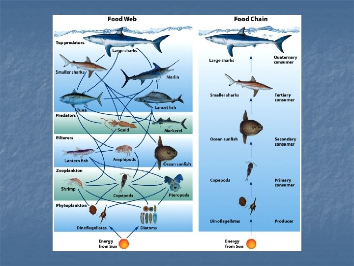 An Oceanic Food Chain n n Tend to have more trophic levels 1 st level - planktonic algae and planktonic bacteria 2 nd level - zooplankton and some fish 3 rd level - fish and invertebrates feed on herbivores, baleen whales 4 th+ levels - killer whales, predatory fish