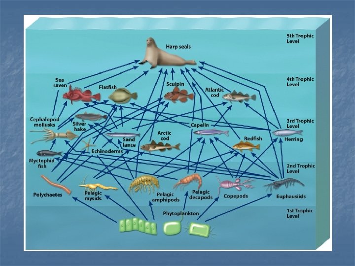 Complex Food Web - Harp Seal n n Most species feed on several trophic levels Harp seal (shown at 5 th level) Feeds on flatfish (4 th level) n But also feed on foods from 2 nd – 4 th n A species that feeds on several levels placed in a category one above the highest level it feeds on n