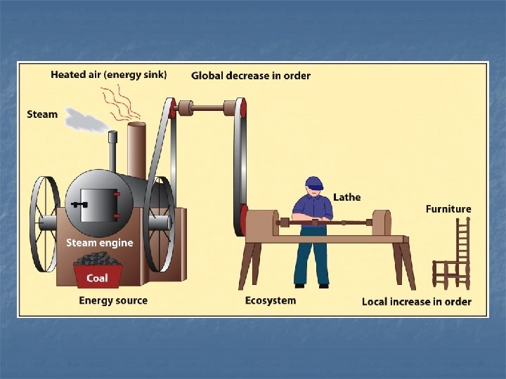 Laws of Thermodynamics n Energy must continually be added to an ecological system in a usable form Because inevitably degraded into heat n Net flow of energy is a one way flow n n Second Law of Thermodynamics No use of energy is ever 100% efficient n Energy is lost to heat n