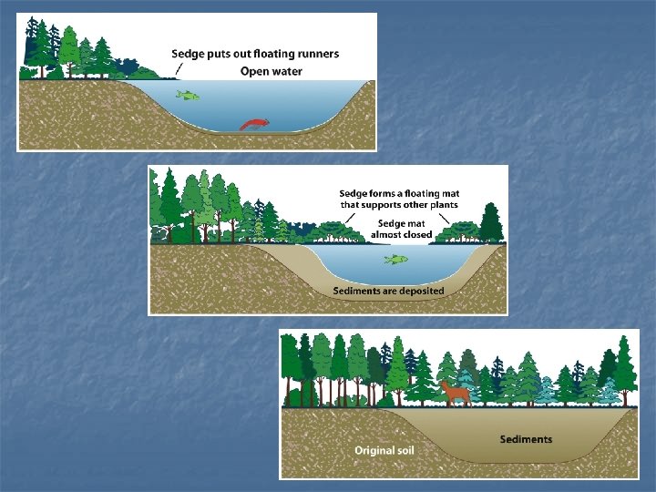 Bog Succession n n Bog - Open body of water with surface inlets but no surface outlets Succession: Sedge puts out floating runners n Wind blows particles into the mat of runners n Seeds land on runners and germinate n Mat becomes thicker and shrubs and trees develop n