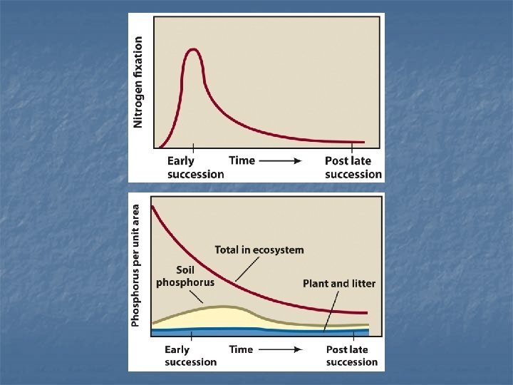 General Patterns of Succession n In early stages of succession n n Biomass and biological diversity increase In middle stages Gross production increase and net production decrease n Organic material in soil increases, as does chemical element storage n