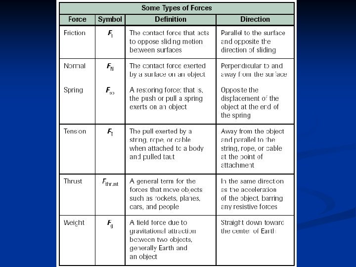 Types of Forces n Contact force n n Example: Your book laying on the desk Field force n Example: You drop your textbook onto the floor.