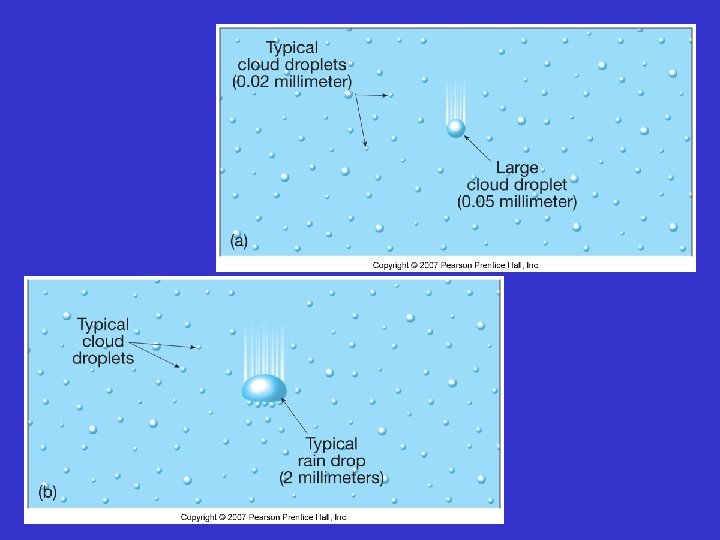 • Growth of cloud droplets – Hygroscopic nuclei – water seeking particles like salt, smoke from combustion (fire). • Hygroscopic nuclei tend to form very large rain drops. – Hydrophobic nuclei – water-repelling particles like dust. • Hydrophobic nuclei tend to form much smaller rain drops.