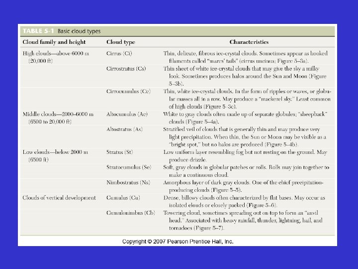 • Three basic cloud forms are recognized. 1. Cirrus – High, white, and thin – often appear feathery or wispy. 2. Cumulus – consist of globular individual cloud masses. Look like cauliflower. Often have a flat base and a rising dome. 3. Stratus – sheets or layers. No distinct individual clouds.