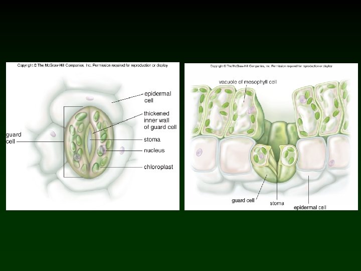 Introduction v Green leaves capture light energy by means of photosynthesis. • Photosynthesis - Trapping and storing of energy in sugar molecules that are constructed from water and carbon dioxide v Stomata - Tiny pores on lower surfaces of leaves • Allow carbon dioxide to enter and oxygen to diffuse out • Water vapor also escapes via stomata. – Guard Cells control water loss by opening or closing pore of stomatal apparatus.