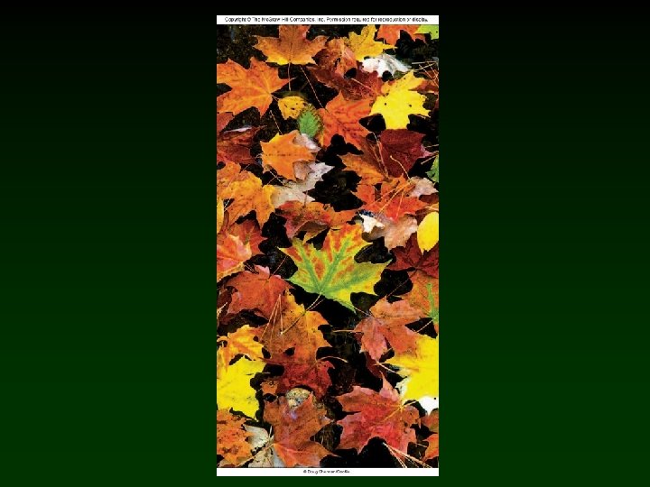 Autumnal Changes in Leaf Color v Chloroplasts of mature leaves contain several groups of pigments: • Chlorophylls - Green • Carotenoids - Yellows • In fall, chlorophylls break down and other colors are revealed. v Water soluble anthocyanins (red or blue) and betacyanins (red) may also be present in the vacuole.