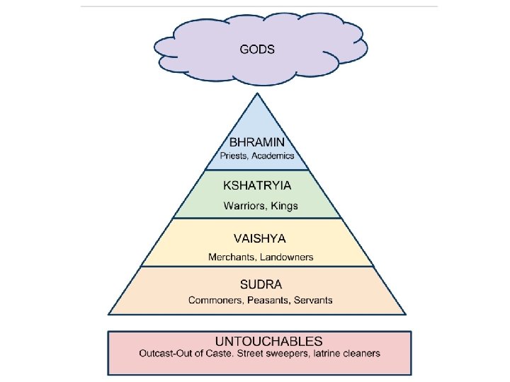 The Caste System • These texts describe the caste system that divides Hindu society into four different groups 1. Brahmins (priests and scholars) 2. Kshatryias (warriors and rulers) 3. Vaishyas (merchants and land owners) 4. Sudras (workers) ________ 5. Untouchables (impure, outside of caste system)