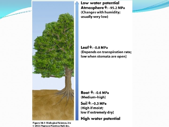 Water Potential Water potential (ψ): H 2 O moves from high ψ low ψ potential Water potential equation: ψ = ψS + ψP Water potential (ψ) = free energy of water Solute potential (ψS) = solute concentration (osmotic potential) Pressure potential (ψP) = physical pressure on solution; turgor pressure (plants) Pure water: ψP = 0 MPa Plant cells: ψP = 1 MPa