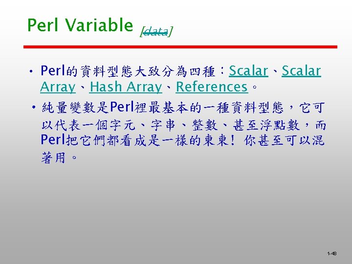 Method to Avoid Implicit Declarations • Some of the problems with implicit declarations can be avoided by requiring names for specific types to begin with particular special characters. • For example, in Perl, – any name that begins with $ is a scalar, which can store either a string or a numeric value. – any name beginning with @ is an array – The above rules create different name spaces for different type variables. In this scenario, the names @apple and %apple are unrelated, because each is from a different name space. – Furthermore, a program reader always knows the type of a variable when reading its name. 1 -47