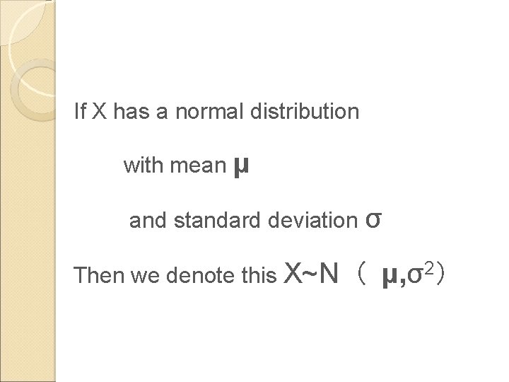 If X has a normal distribution with mean μ and standard deviation σ Then we denote this X~N( μ, σ2)